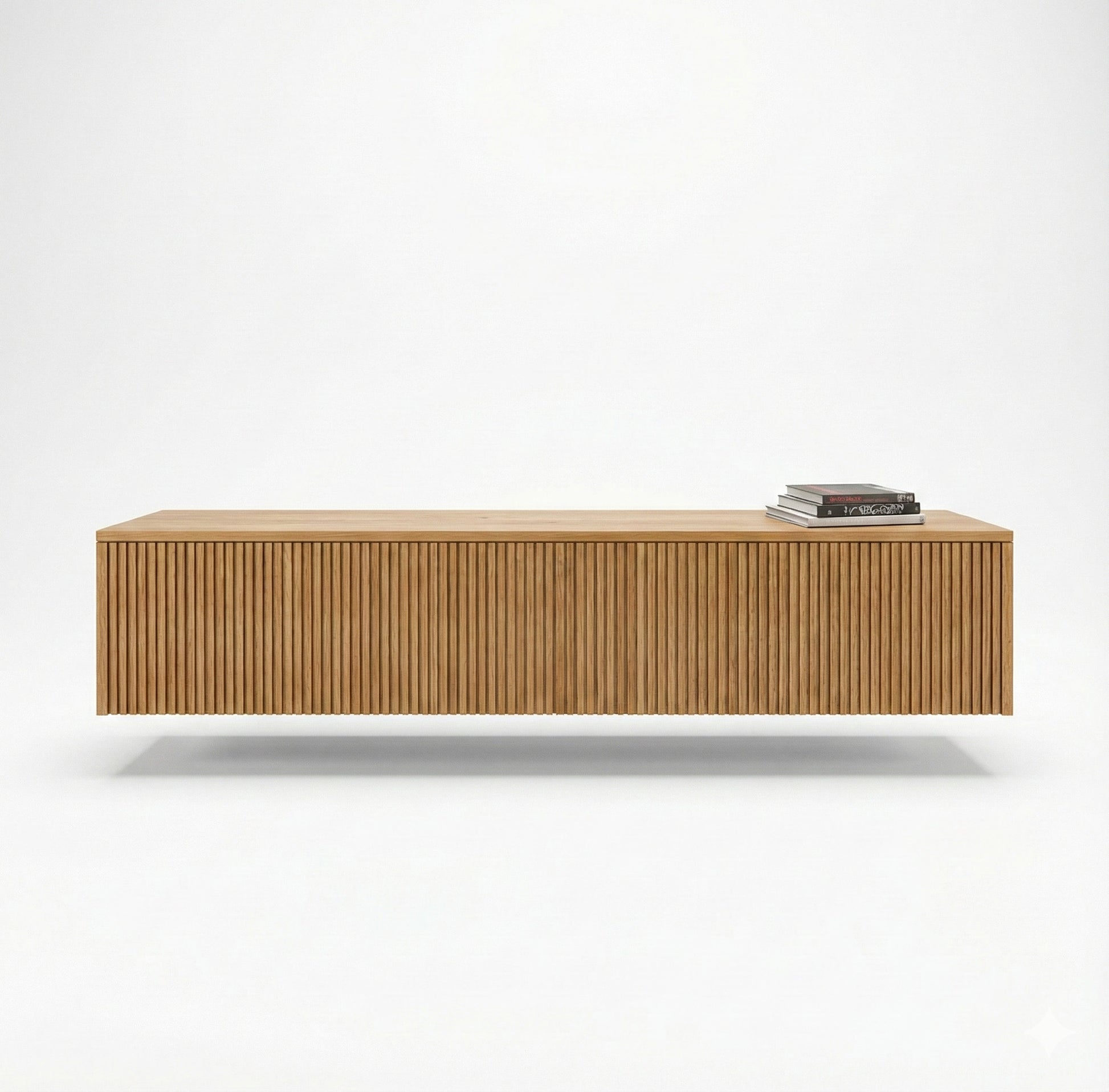 Designed as a wall-mounted piece, it floats effortlessly above the floor, bringing a sense of lightness and modern elegance to any interior. The natural wood finish adds warmth and tactility, while the precise lines speak to a refined, contemporary sensibility. It’s a sideboard created to complement, not compete—perfect for spaces where serenity meets sophistication.