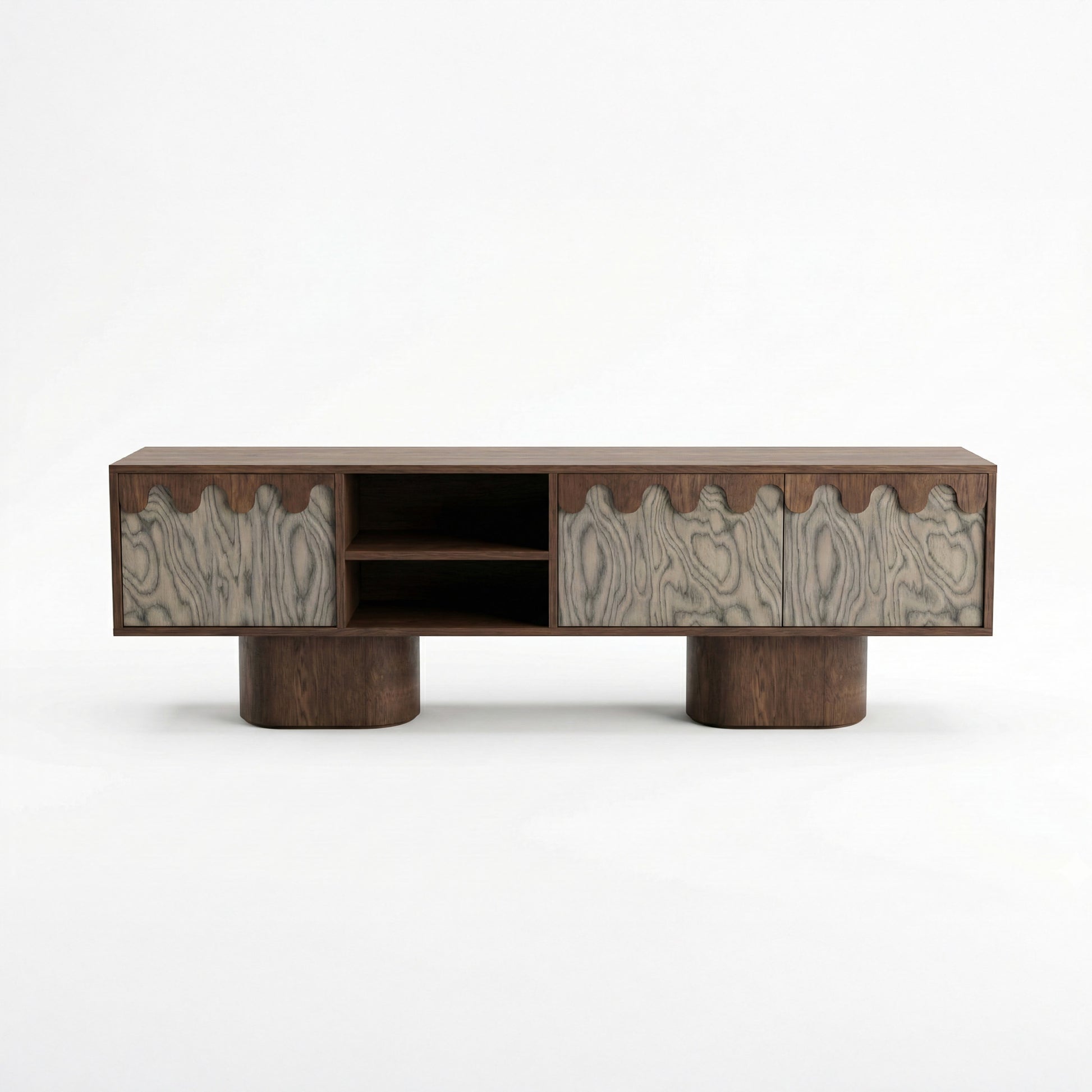 The MERROW sideboard is a designer wooden sideboard that combines sculptural form with everyday functionality. Inspired by mid-century modern aesthetics, its clean horizontal silhouette is enriched with a distinctive wave-like front detail that adds rhythm and depth to the design.